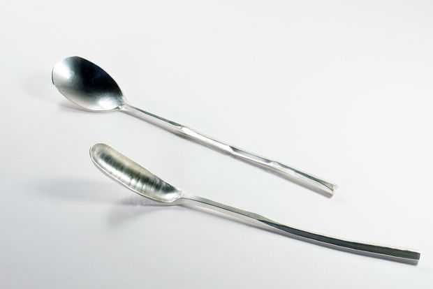 Diese farbstarken Objekte stehen im Kontrast zu den aus Silbertangen geschmiedeten Löffeln, deren kühle Farbe die Umrisse der Formen in den Vordergrund stellt. Die Kraft und Führung des Hammerschlages formt das Sterlingsilber in Antje Dienstbirs prozesshaftem Arbeiten und hinterlässt feinste Strukturen und gespannte Oberflächen.