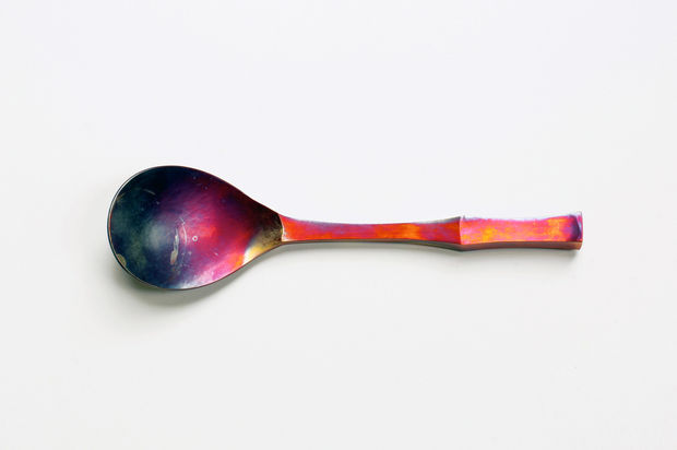 Eine Doppel- oder TrippelLaffe ist aus einem Stück Tafelblech getrieben und ziseliert, wodurch eine individuelle Oberflächenstruktur entsteht. Im Feuer durchläuft Kupfer an der Oberfläche materialbedingt ein ausdrucksstarkes Farbspiel, das auch die aus Kupfervollmaterial geschmiedeten Löffel kennzeichnet.